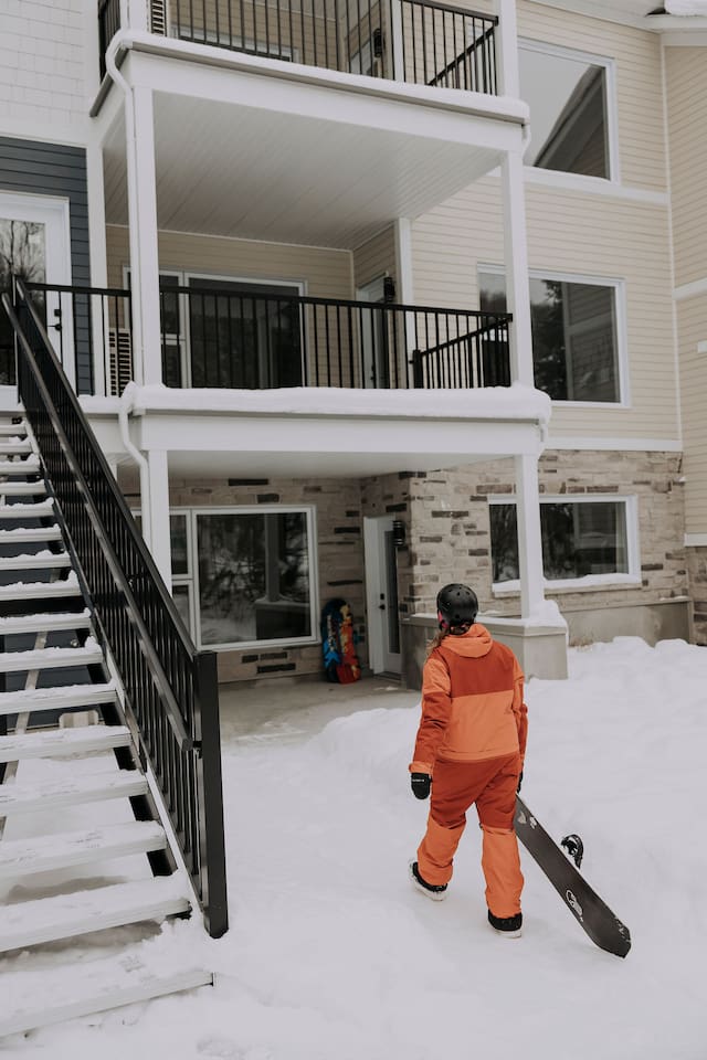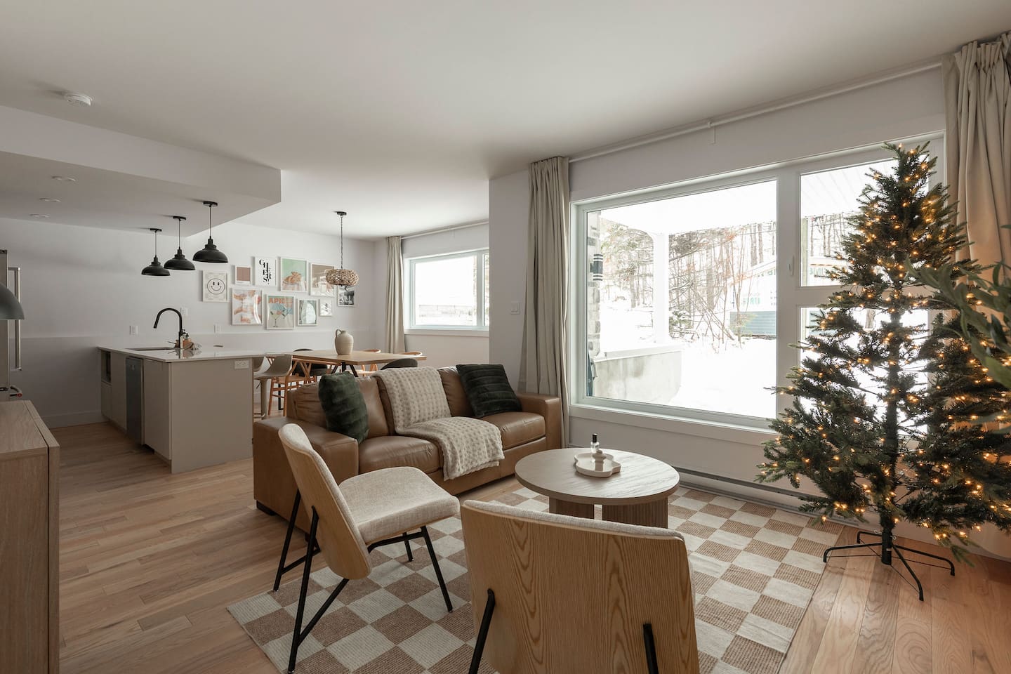 The APRÈS CLUB📍Après, but make it chic. ✔ 1 min Ski In/Out → Mont-Blanc 🎿 (slope #24) ✔ 20 min → Tremblant / Vallée-Bleue 🏂⛷️ ✔ 5 min → Sentier des Cimes 🌄 ✔ Electric fireplace 🔥 ✔ Shared wood fire pit 🔥🪵 ✔ Brand-new construction ✔ Beautifully designed, trendy condo ✨ ✔ Smart TV 📺 ✔ Fully e...